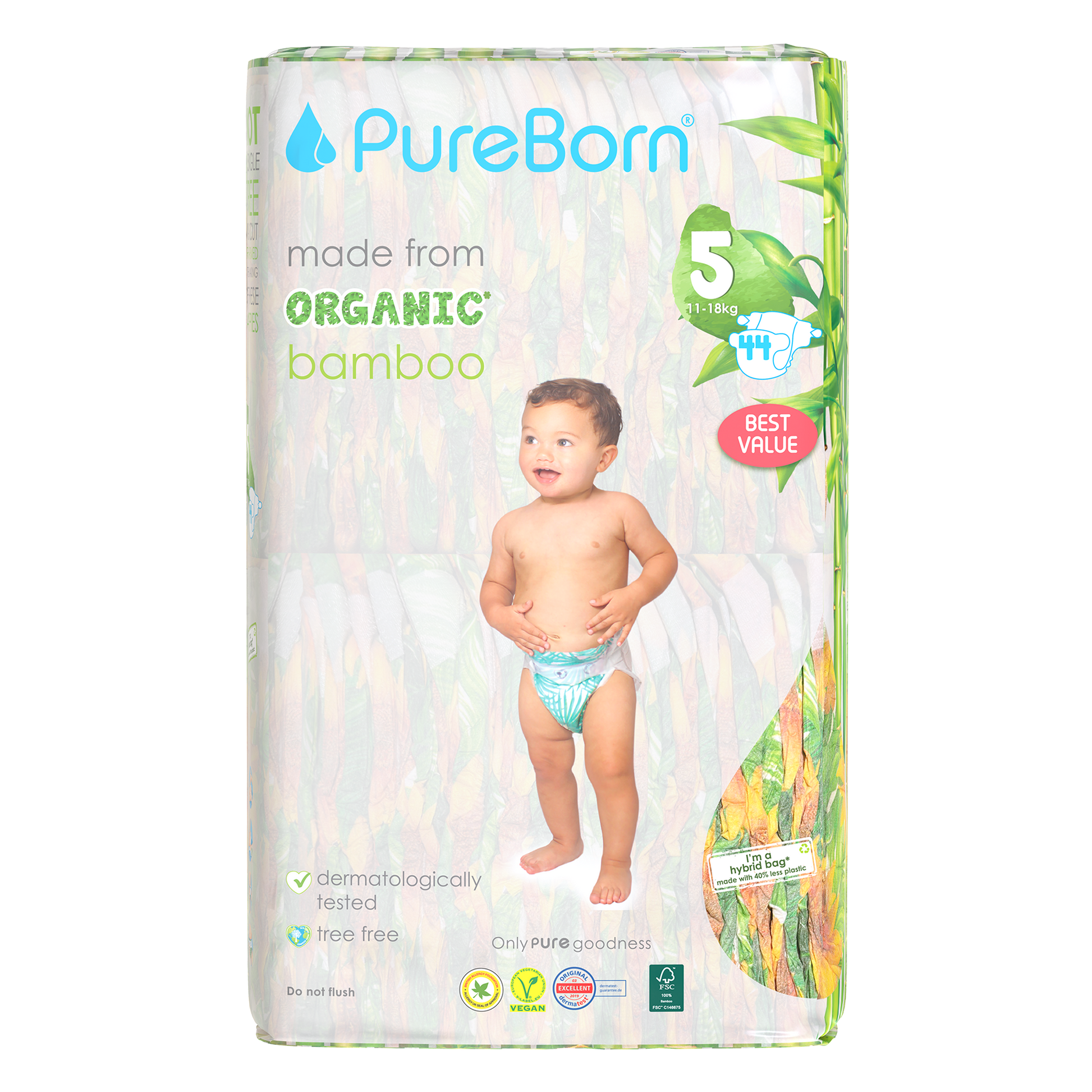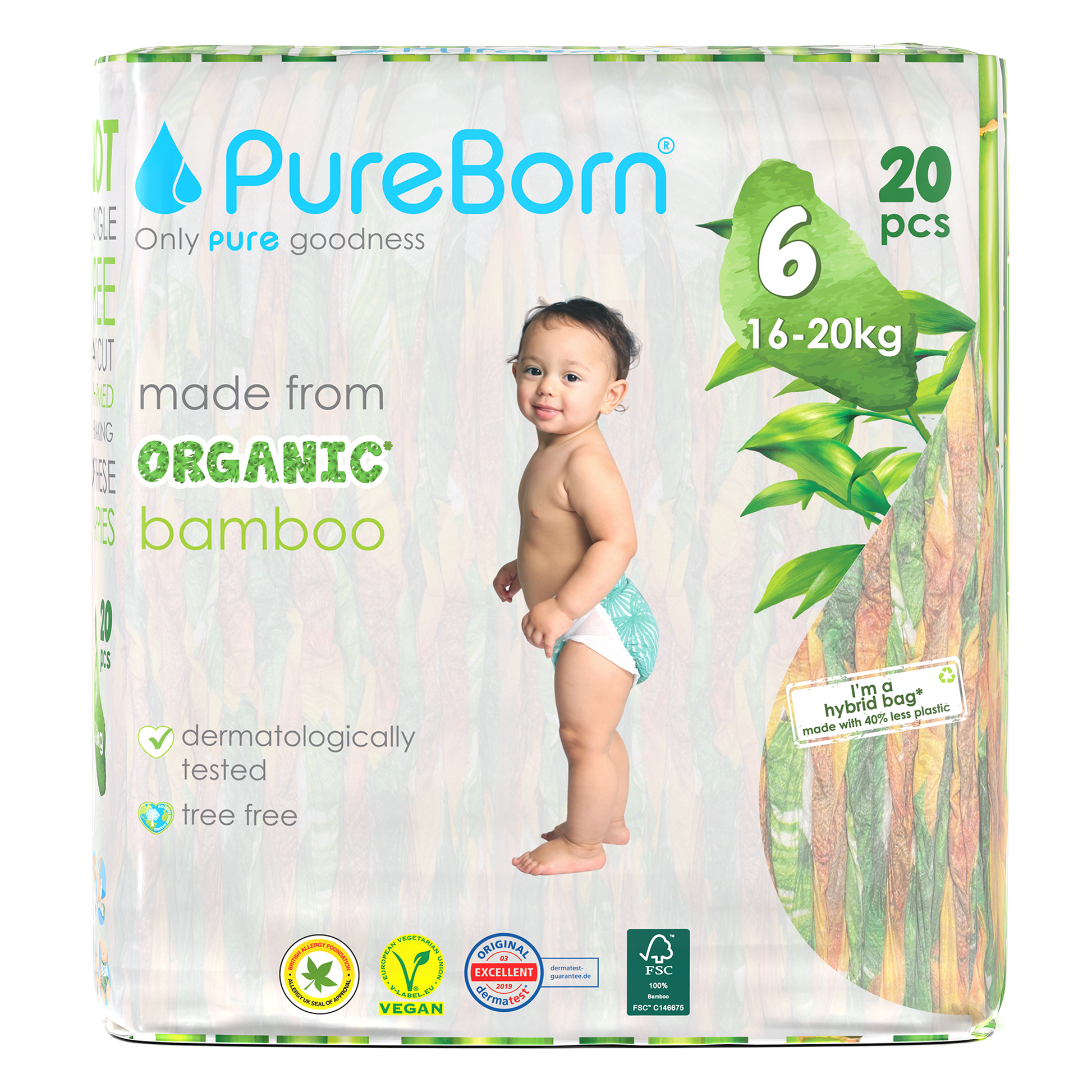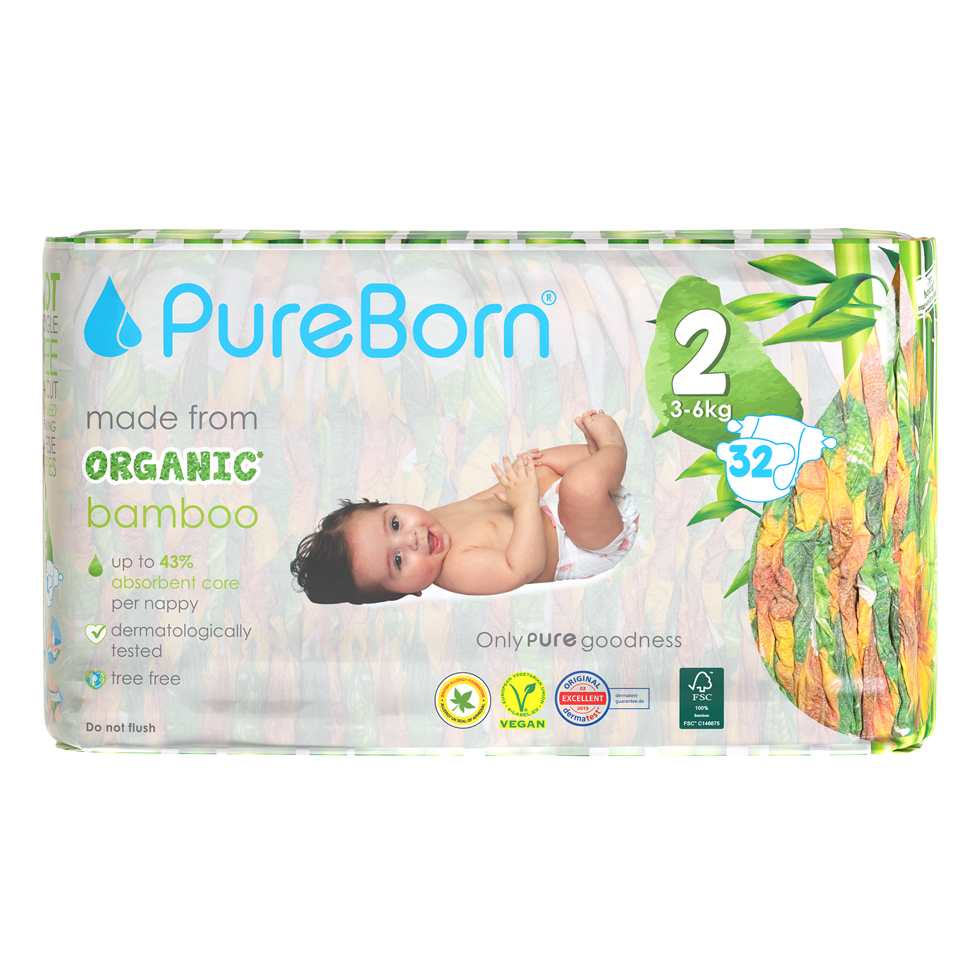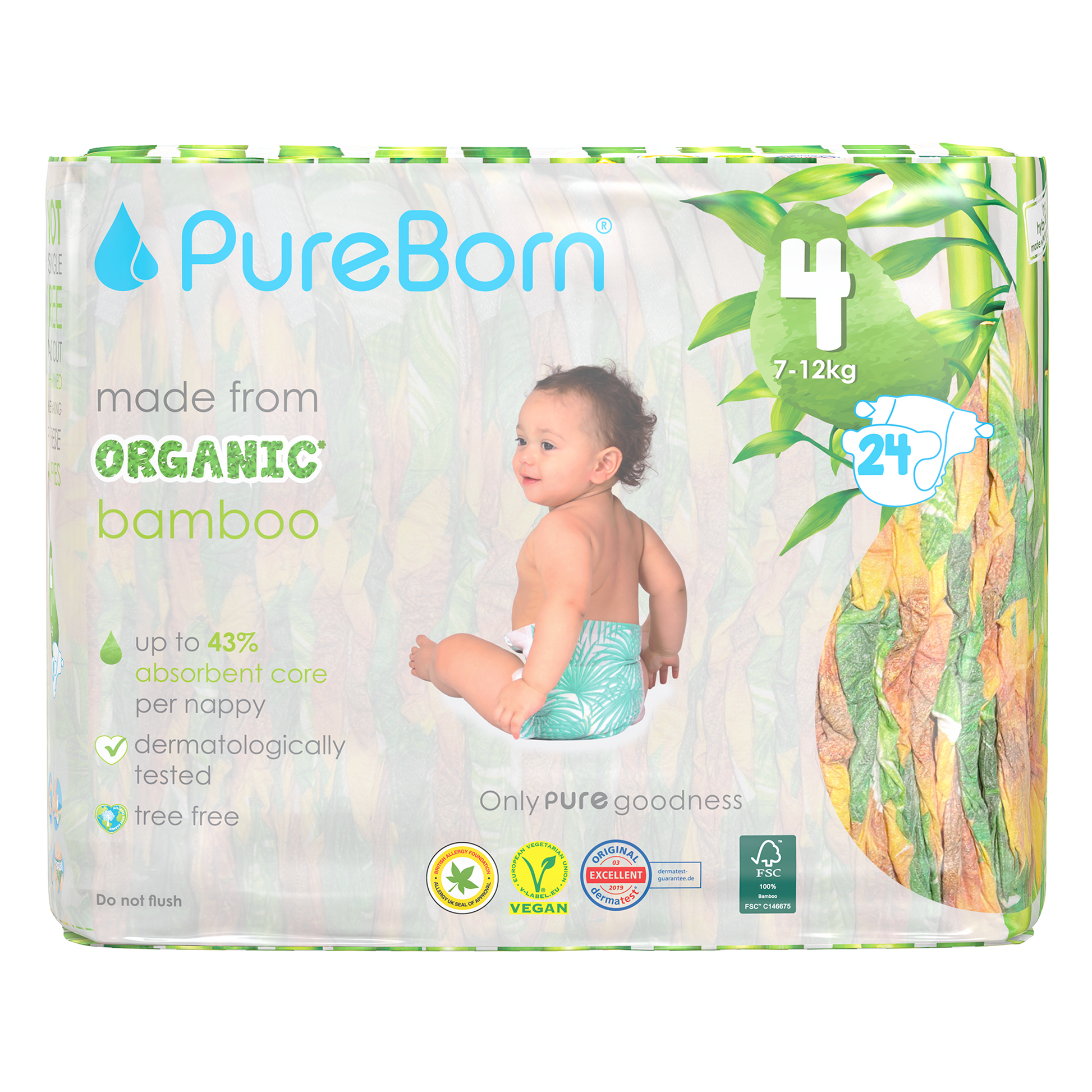 The core of our nappies are made from FSC certified organic bamboo pulp and SAP (Super Absorbent Polymer) making them super soft on your baby’s skin. The outer part of our nappies are made up of sustainably-sourced safe adhesives, materials and inks that do not contain heavy metals or lead. Our nappies are Dermatologically Tested, Vegan and Cruelty Free. We promise to only use safe, PURE ingredients across all of our products.