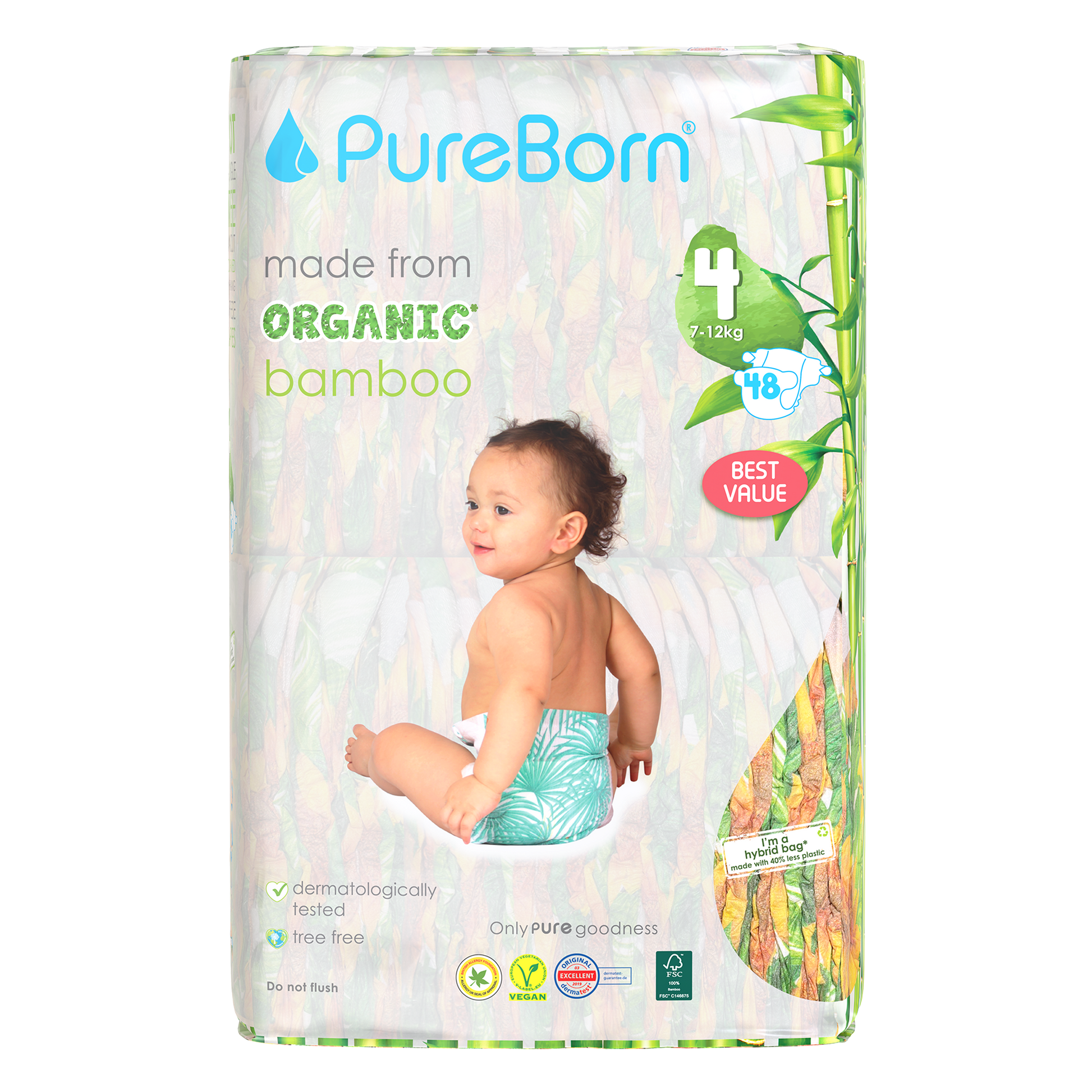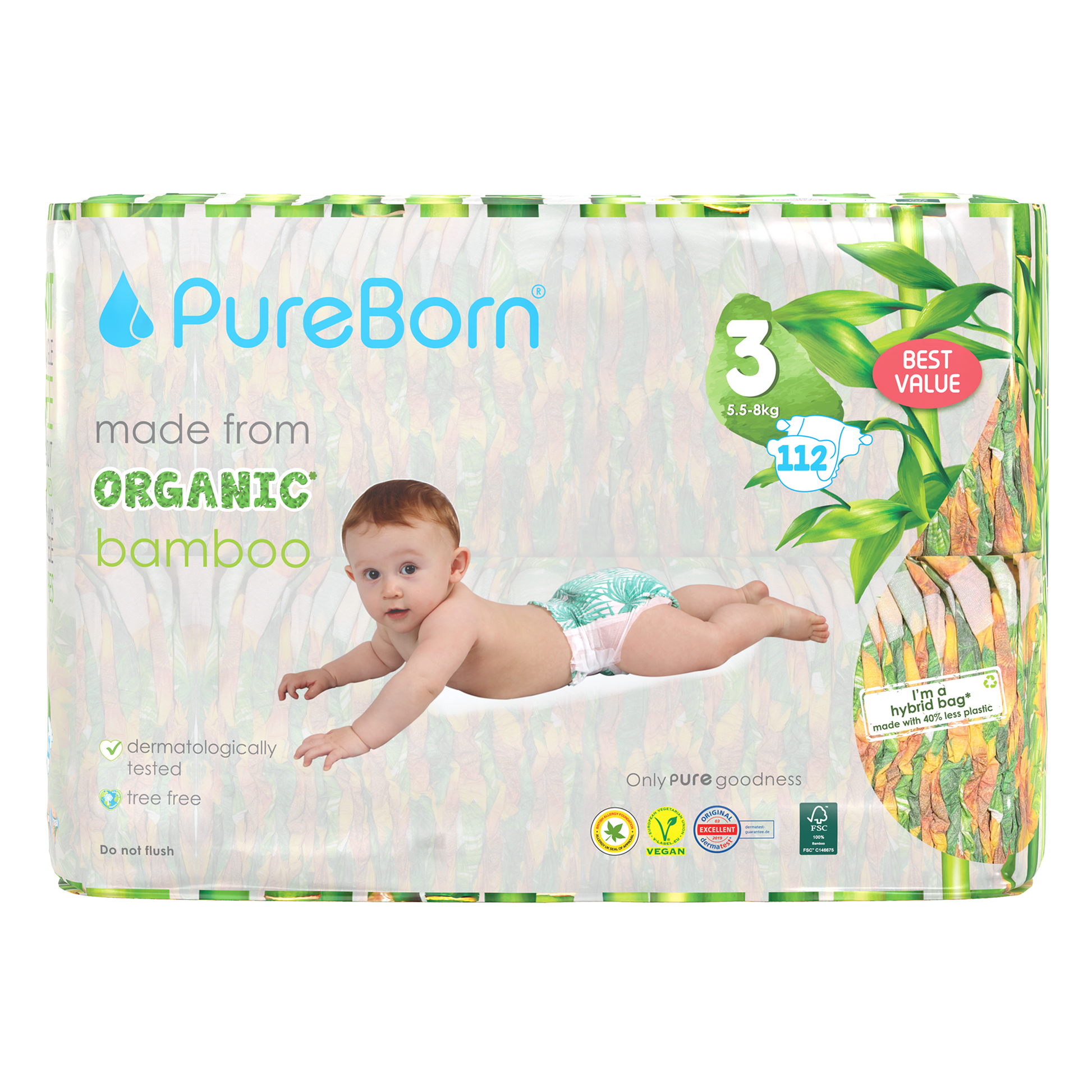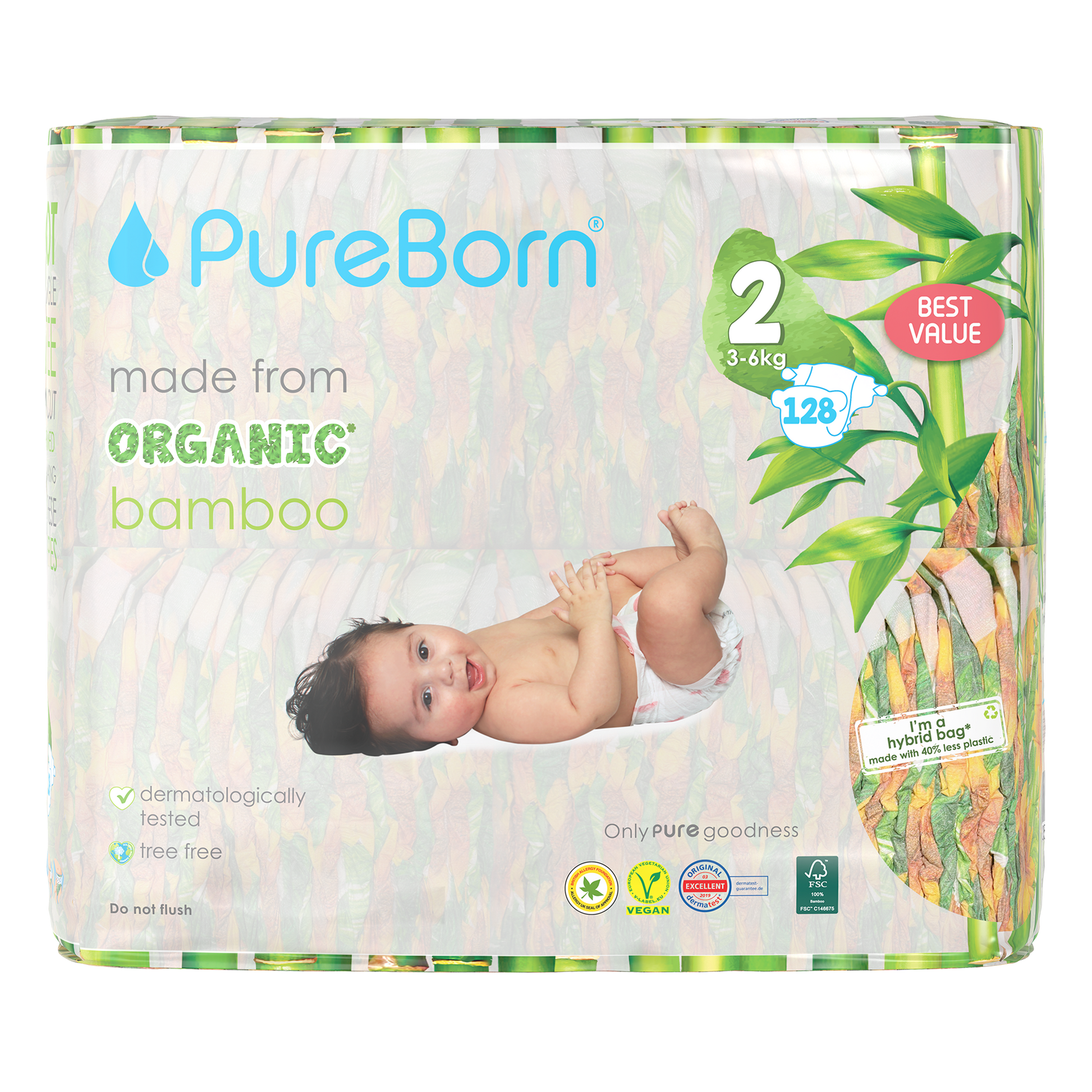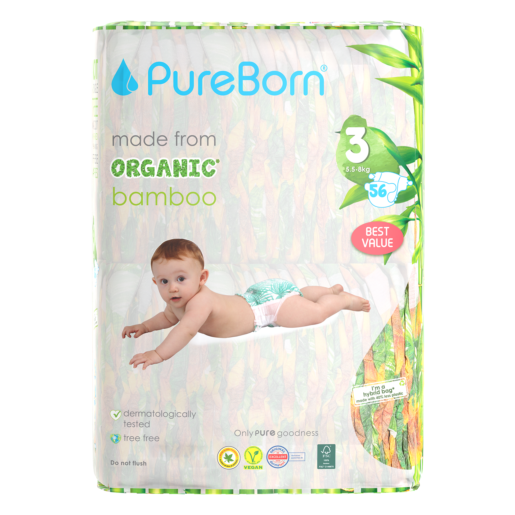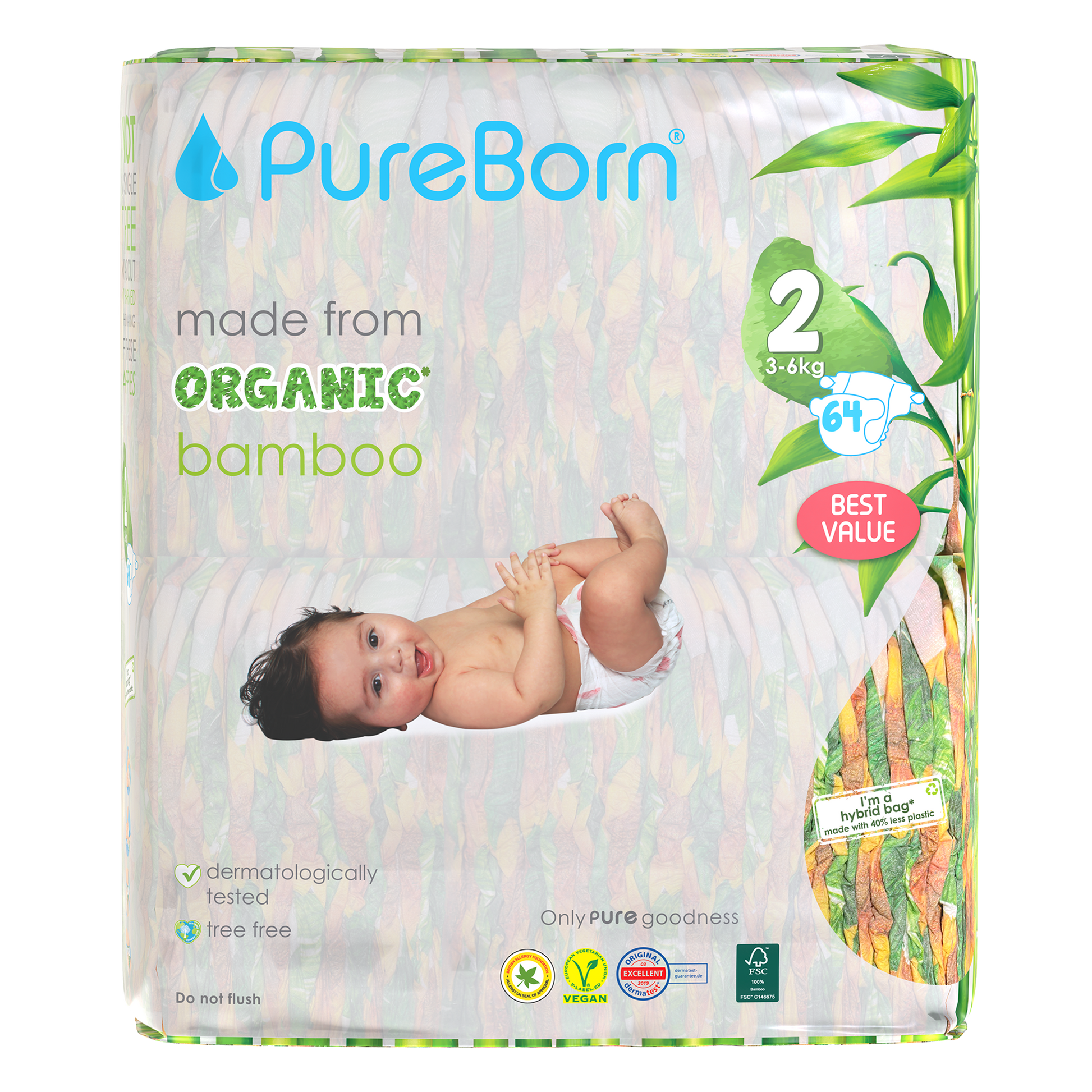 The core of our nappies are made from FSC certified organic bamboo pulp and SAP (Super Absorbent Polymer) making them super soft on your baby’s skin. The outer part of our nappies are made up of sustainably-sourced safe adhesives, materials and inks that do not contain heavy metals or lead. Our nappies are Dermatologically Tested, Vegan and Cruelty Free. We promise to only use safe, PURE ingredients across all of our products.