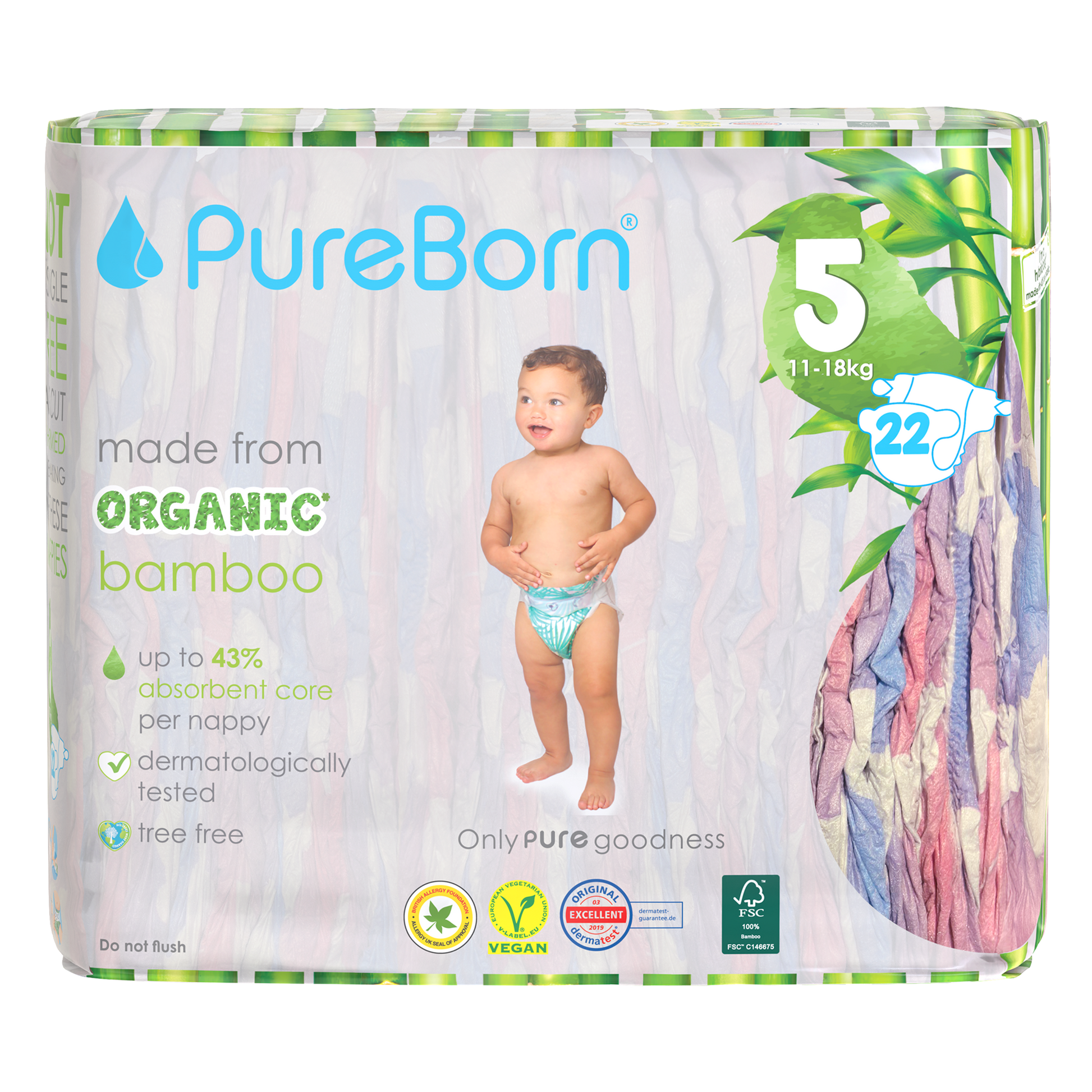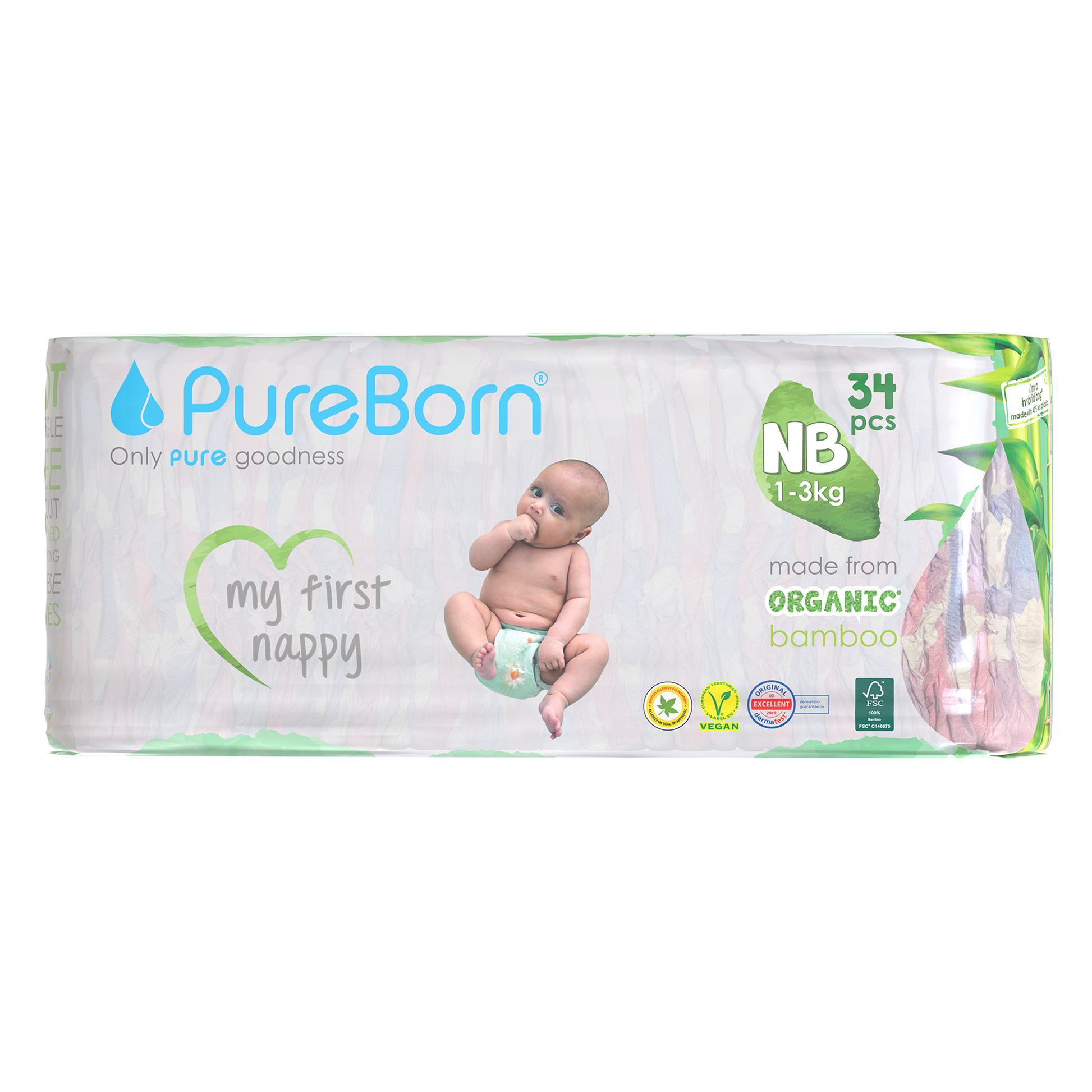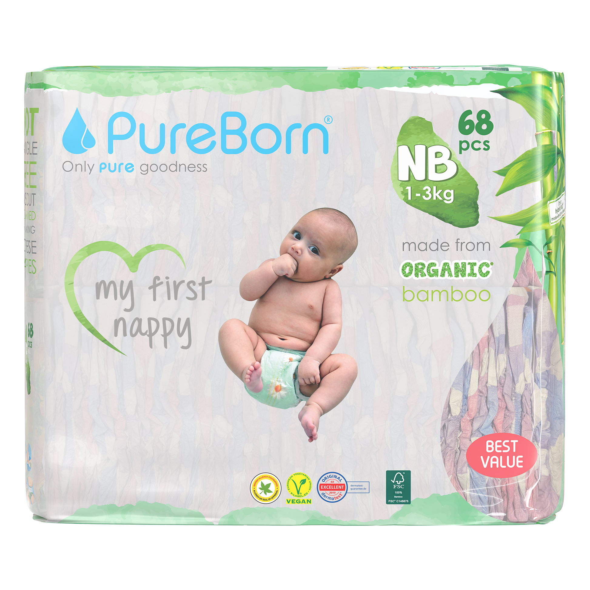 The core of our nappies are made from FSC certified organic bamboo pulp and SAP (Super Absorbent Polymer) making them super soft on your baby’s skin. The outer part of our nappies are made up of sustainably-sourced safe adhesives, materials and inks that do not contain heavy metals or lead. Our nappies are Dermatologically Tested, Vegan and Cruelty Free. We promise to only use safe, PURE ingredients across all of our products.