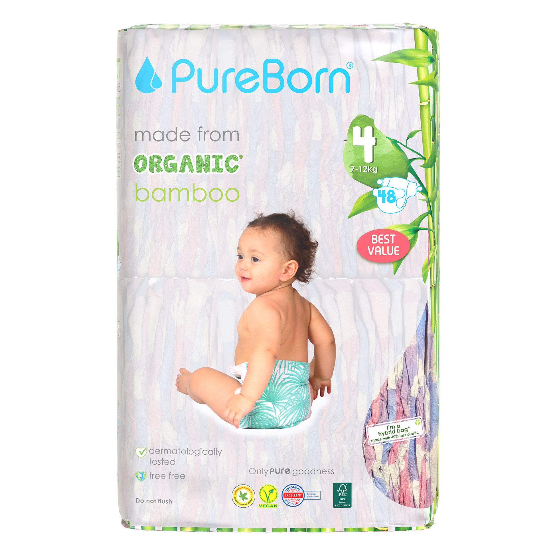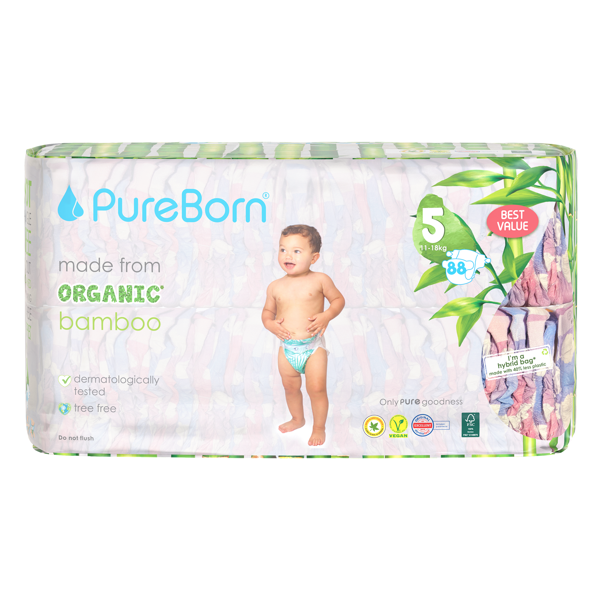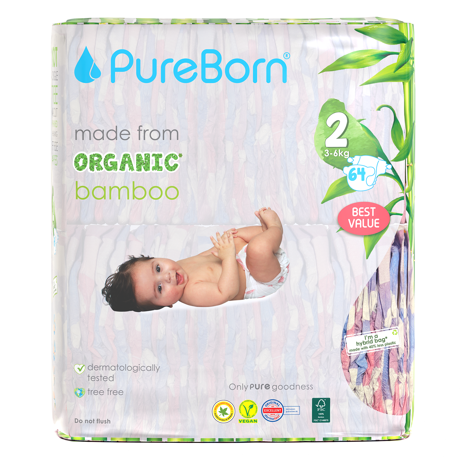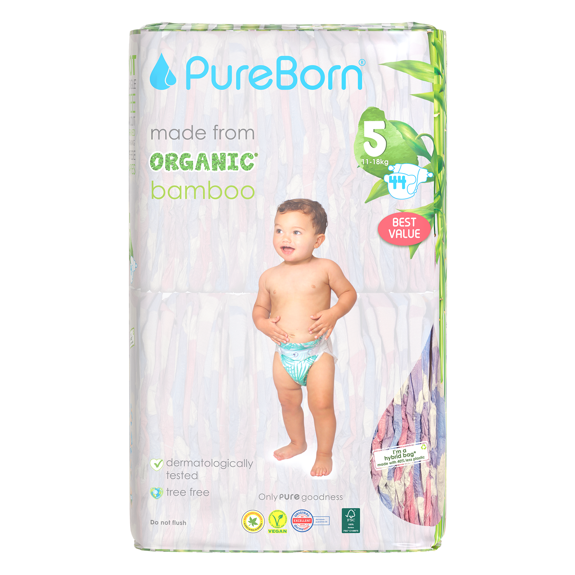 The core of our nappies are made from FSC certified organic bamboo pulp and SAP (Super Absorbent Polymer) making them super soft on your baby’s skin. The outer part of our nappies are made up of sustainably-sourced safe adhesives, materials and inks that do not contain heavy metals or lead. Our nappies are Dermatologically Tested, Vegan and Cruelty Free. We promise to only use safe, PURE ingredients across all of our products.