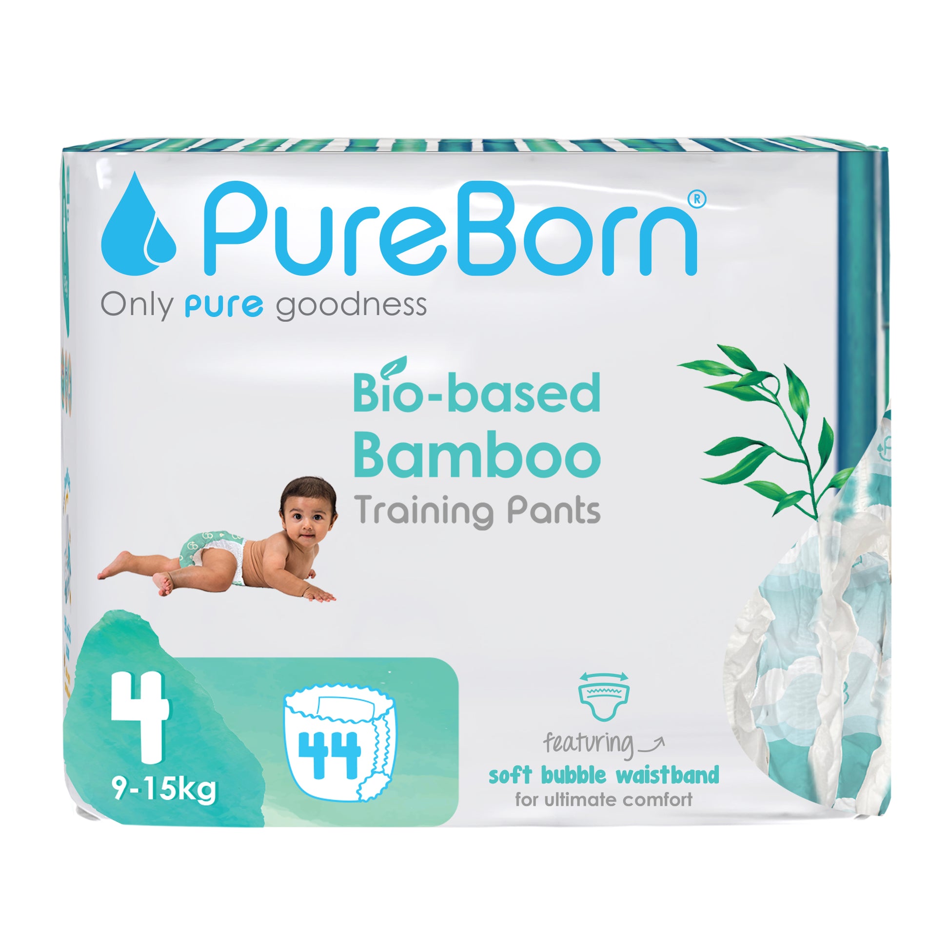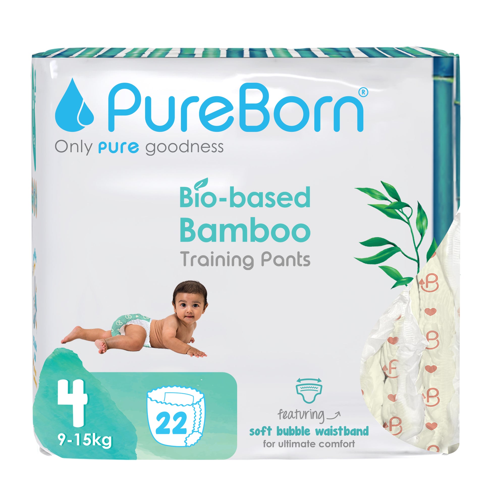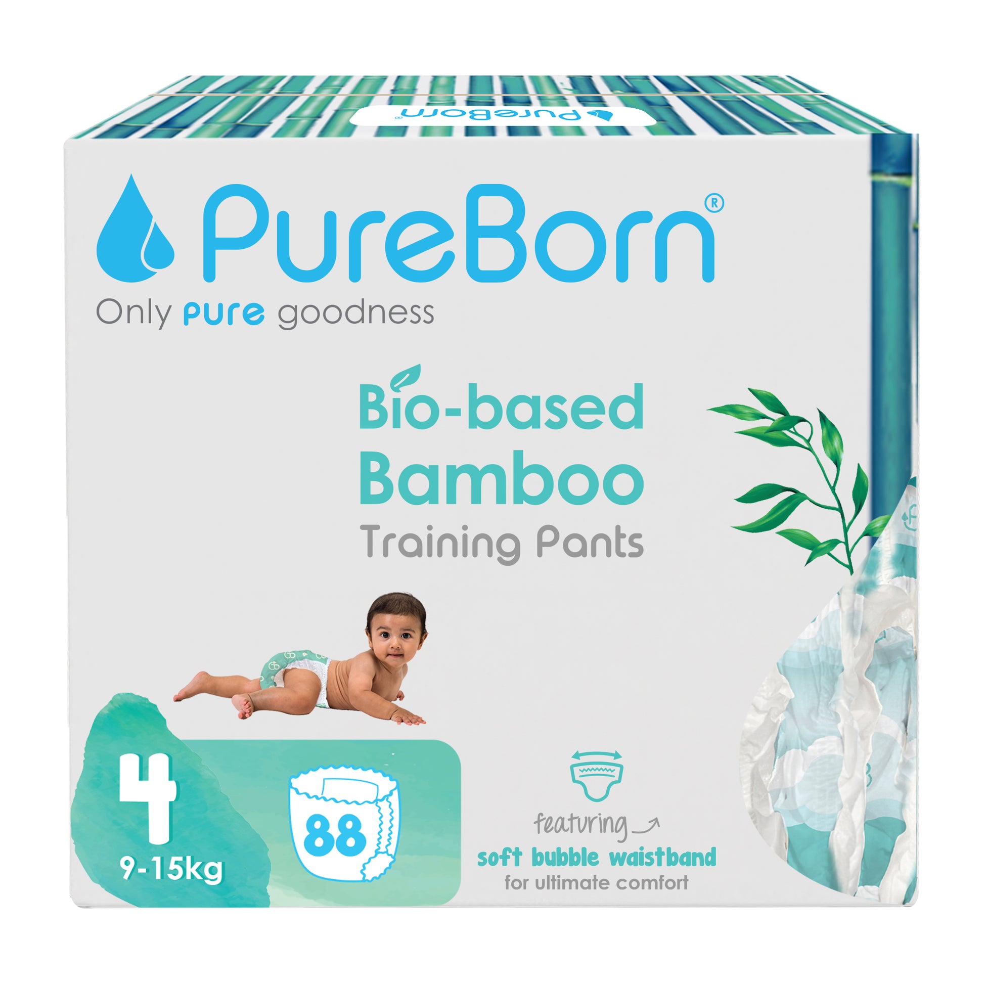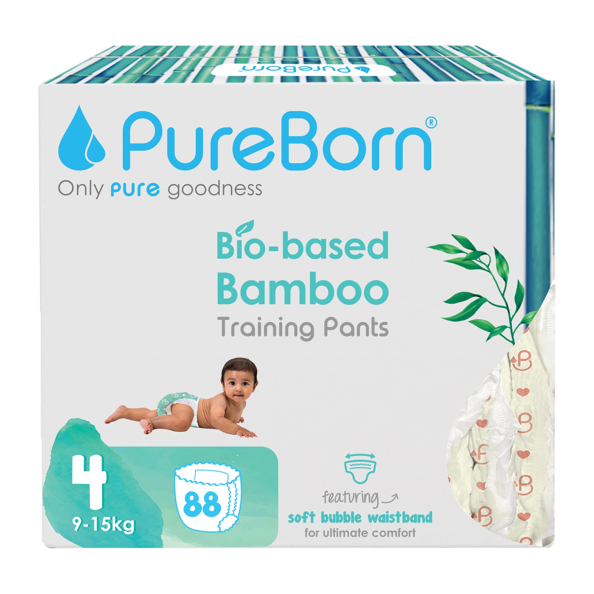 PureBorn Day Dreams Pants are crafted from bio-based bamboo fibers, ensuring a soft, eco-friendly experience for your little one. These pants feature a soft bubble waistband for a comfortable fit and are made with FSC-certified wood pulp core for responsible, sustainable care. The extra-soft top sheet, derived from sustainably harvested corn and sugarcane, provides added comfort while maintaining up to 12 hours of dry protection. Dermatologically tested, vegan, and cruelty-free, these pants offer a wider fit for flexibility and movement, ensuring your baby stays comfortable throughout the day.
