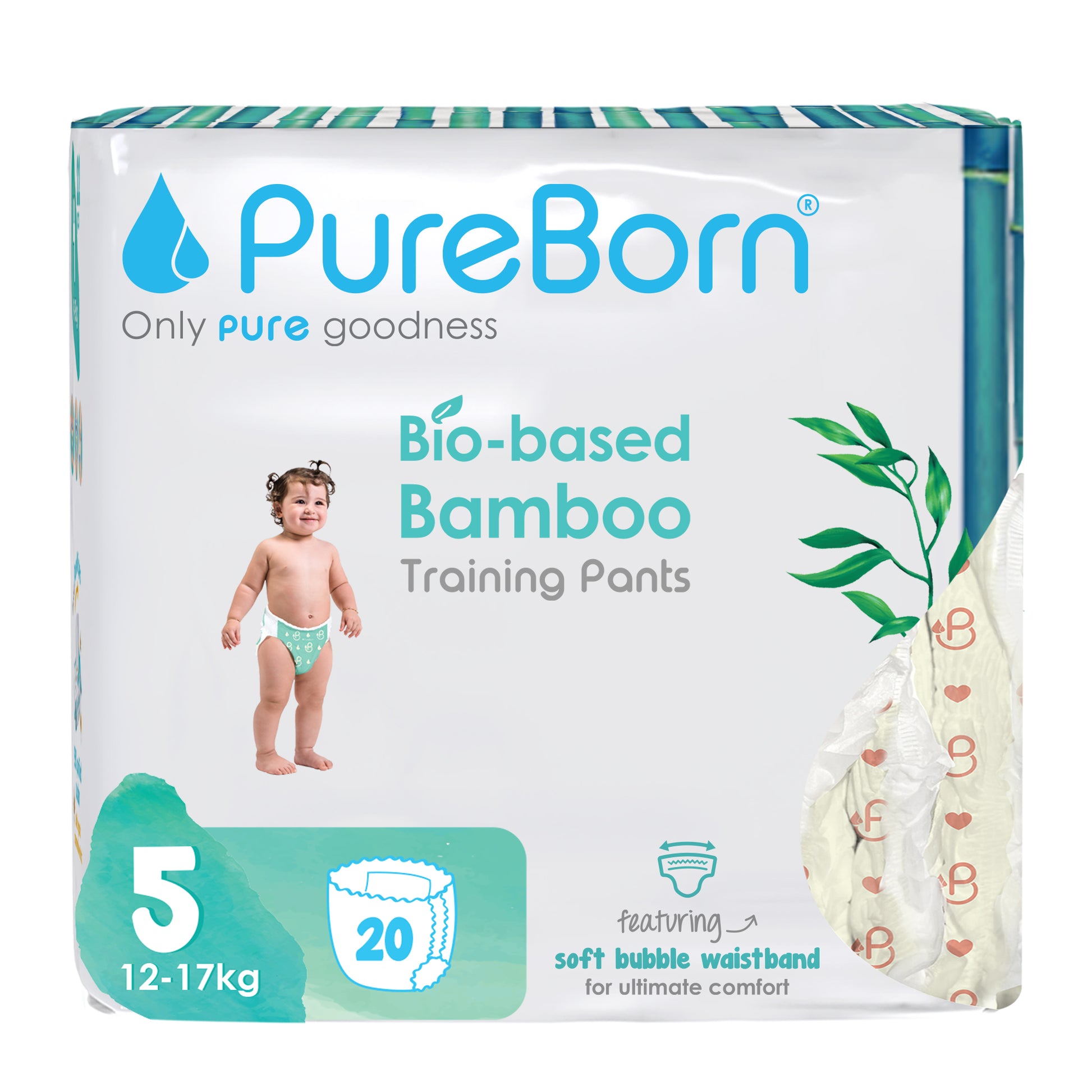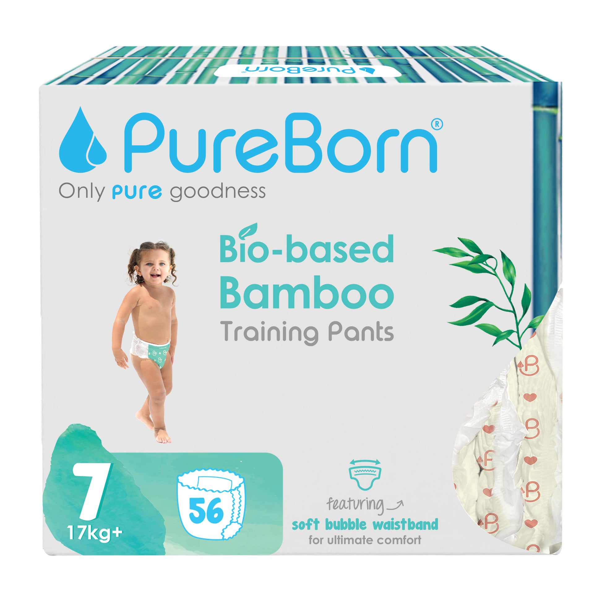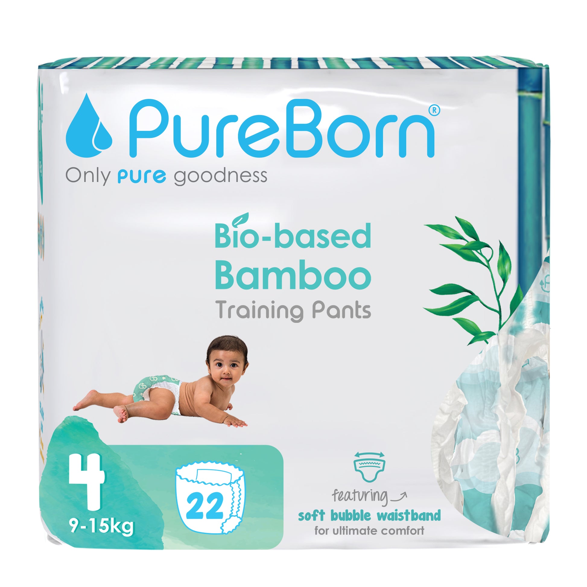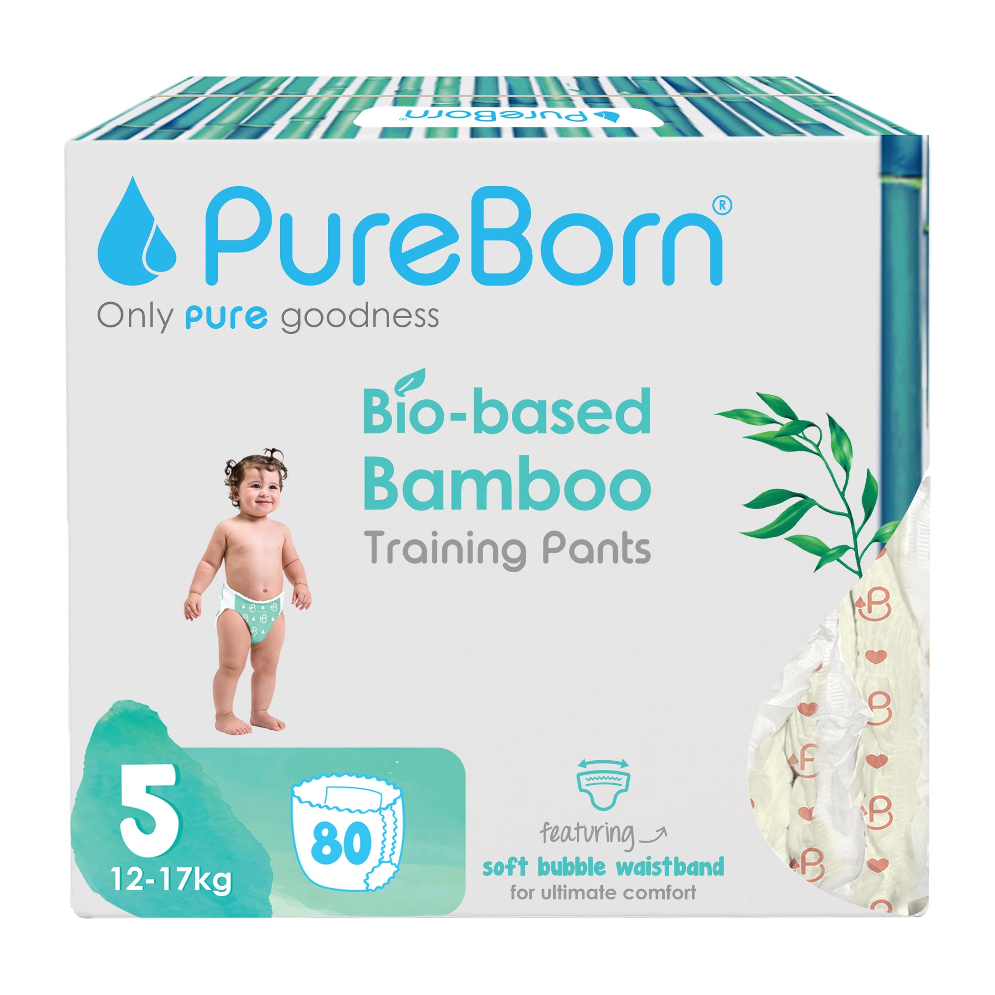 PureBorn Day Dreams Pants are crafted from bio-based bamboo fibers, ensuring a soft, eco-friendly experience for your little one. These pants feature a soft bubble waistband for a comfortable fit and are made with FSC-certified wood pulp core for responsible, sustainable care. The extra-soft top sheet, derived from sustainably harvested corn and sugarcane, provides added comfort while maintaining up to 12 hours of dry protection. Dermatologically tested, vegan, and cruelty-free, these pants offer a wider fit for flexibility and movement, ensuring your baby stays comfortable throughout the day.