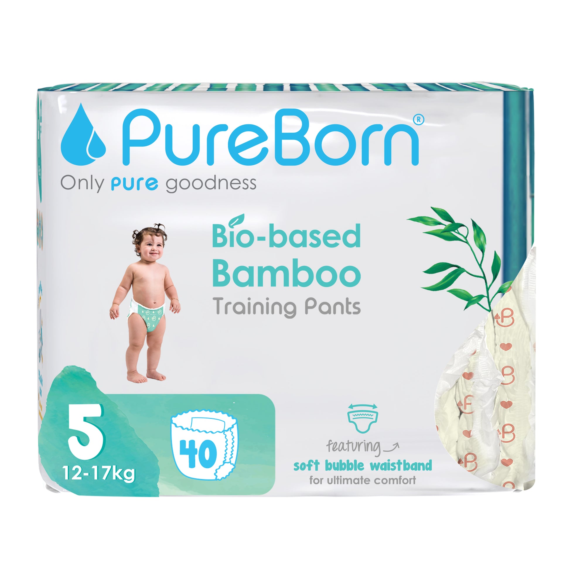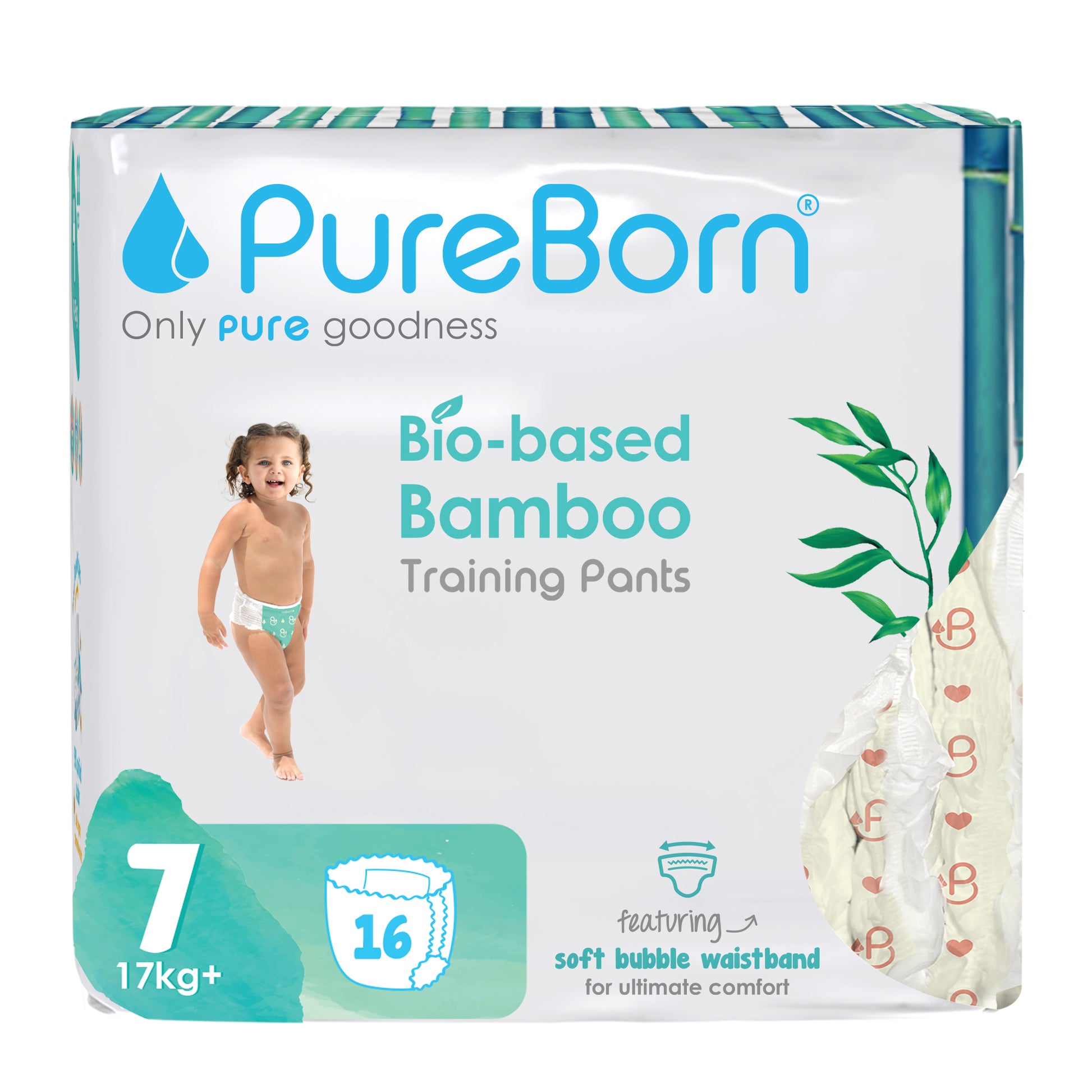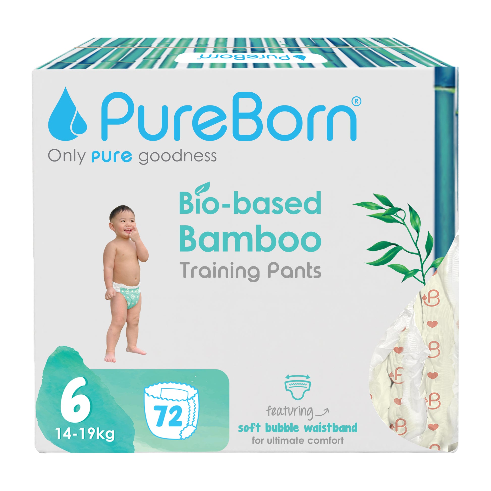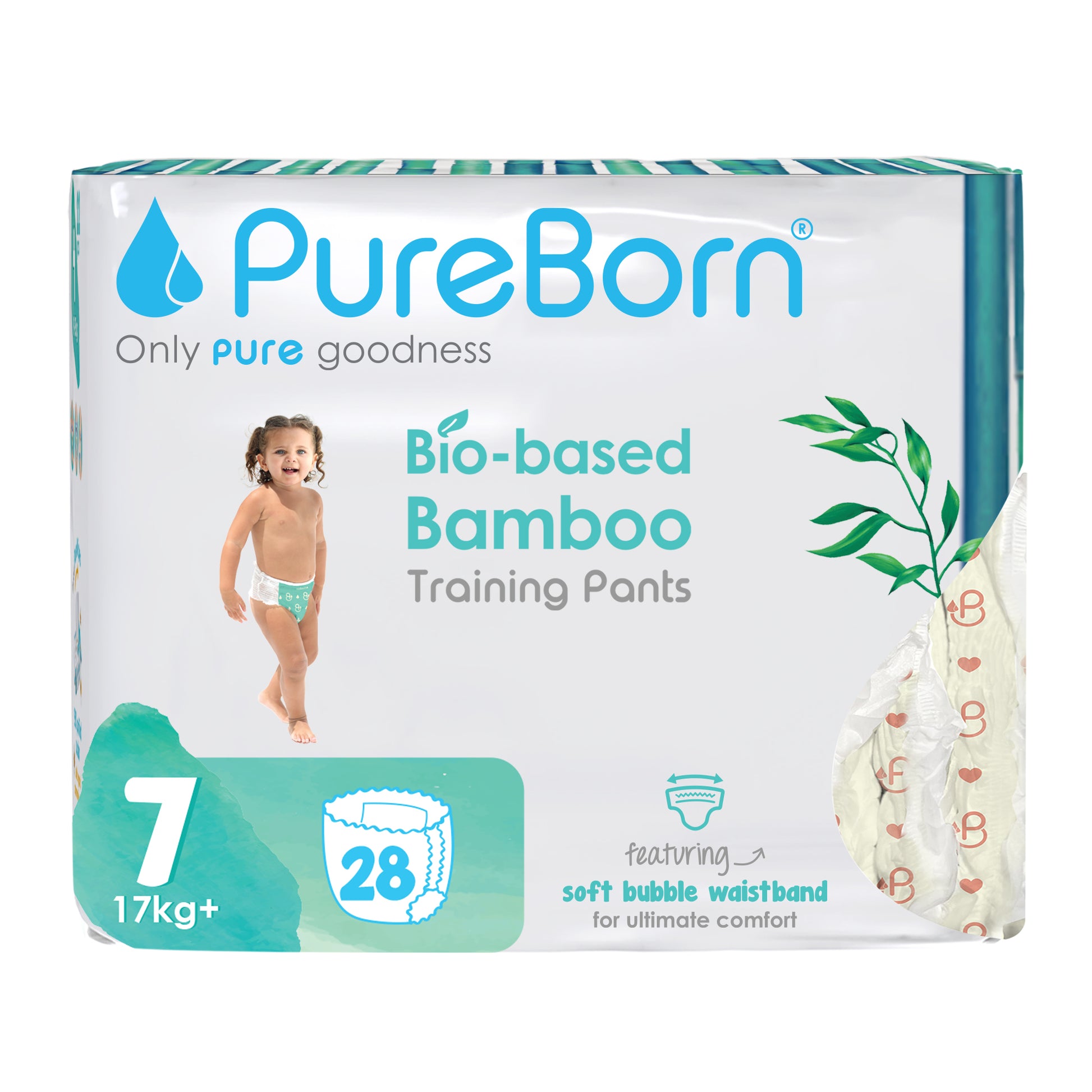 PureBorn Day Dreams Pants are crafted from bio-based bamboo fibers, ensuring a soft, eco-friendly experience for your little one. These pants feature a soft bubble waistband for a comfortable fit and are made with FSC-certified wood pulp core for responsible, sustainable care. The extra-soft top sheet, derived from sustainably harvested corn and sugarcane, provides added comfort while maintaining up to 12 hours of dry protection. Dermatologically tested, vegan, and cruelty-free, these pants offer a wider fit for flexibility and movement, ensuring your baby stays comfortable throughout the day.