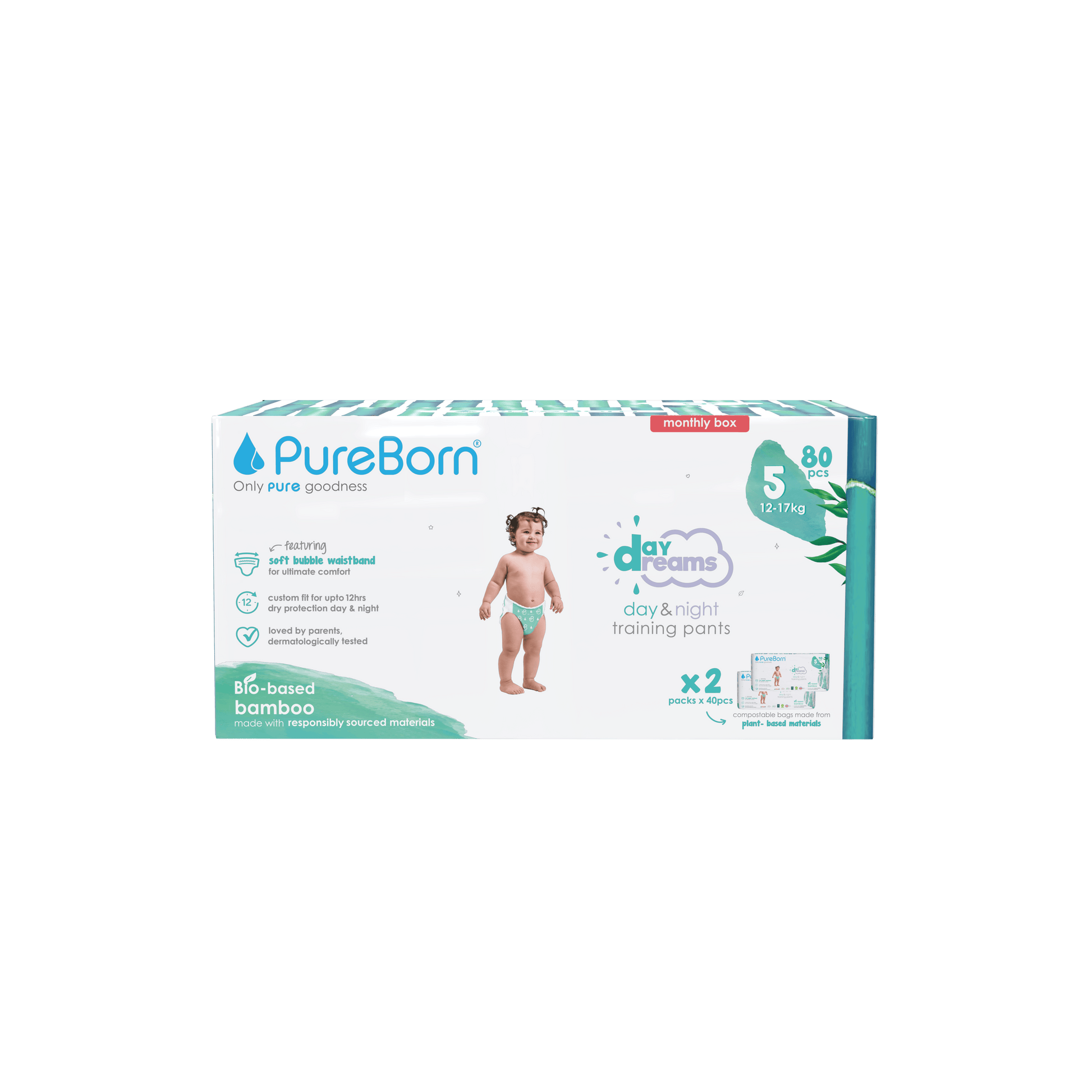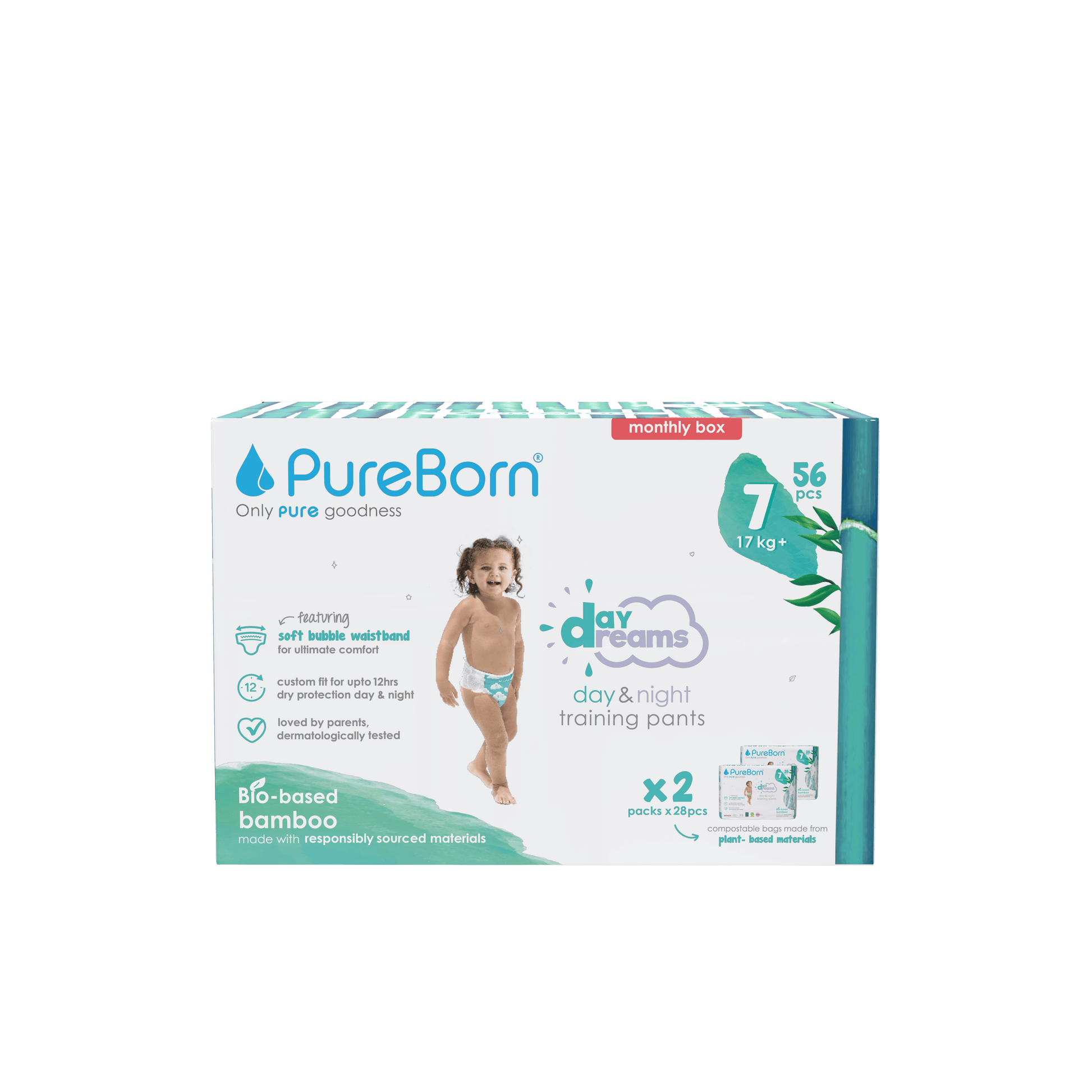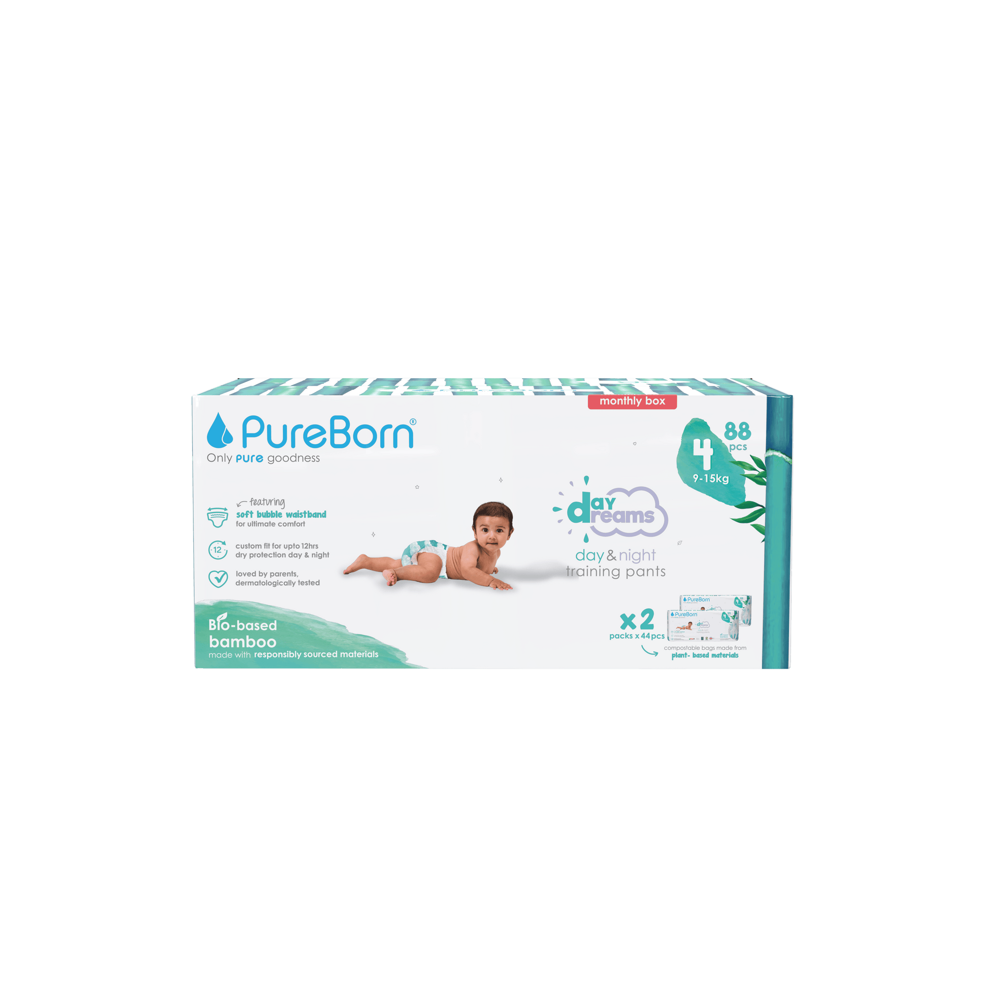 PureBorn Day Dreams Pants are crafted from bio-based bamboo fibers, ensuring a soft, eco-friendly experience for your little one. These pants feature a soft bubble waistband for a comfortable fit and are made with FSC-certified wood pulp core for responsible, sustainable care. The extra-soft top sheet, derived from sustainably harvested corn and sugarcane, provides added comfort while maintaining up to 12 hours of dry protection. Dermatologically tested, vegan, and cruelty-free, these pants offer a wider fit for flexibility and movement, ensuring your baby stays comfortable throughout the day.