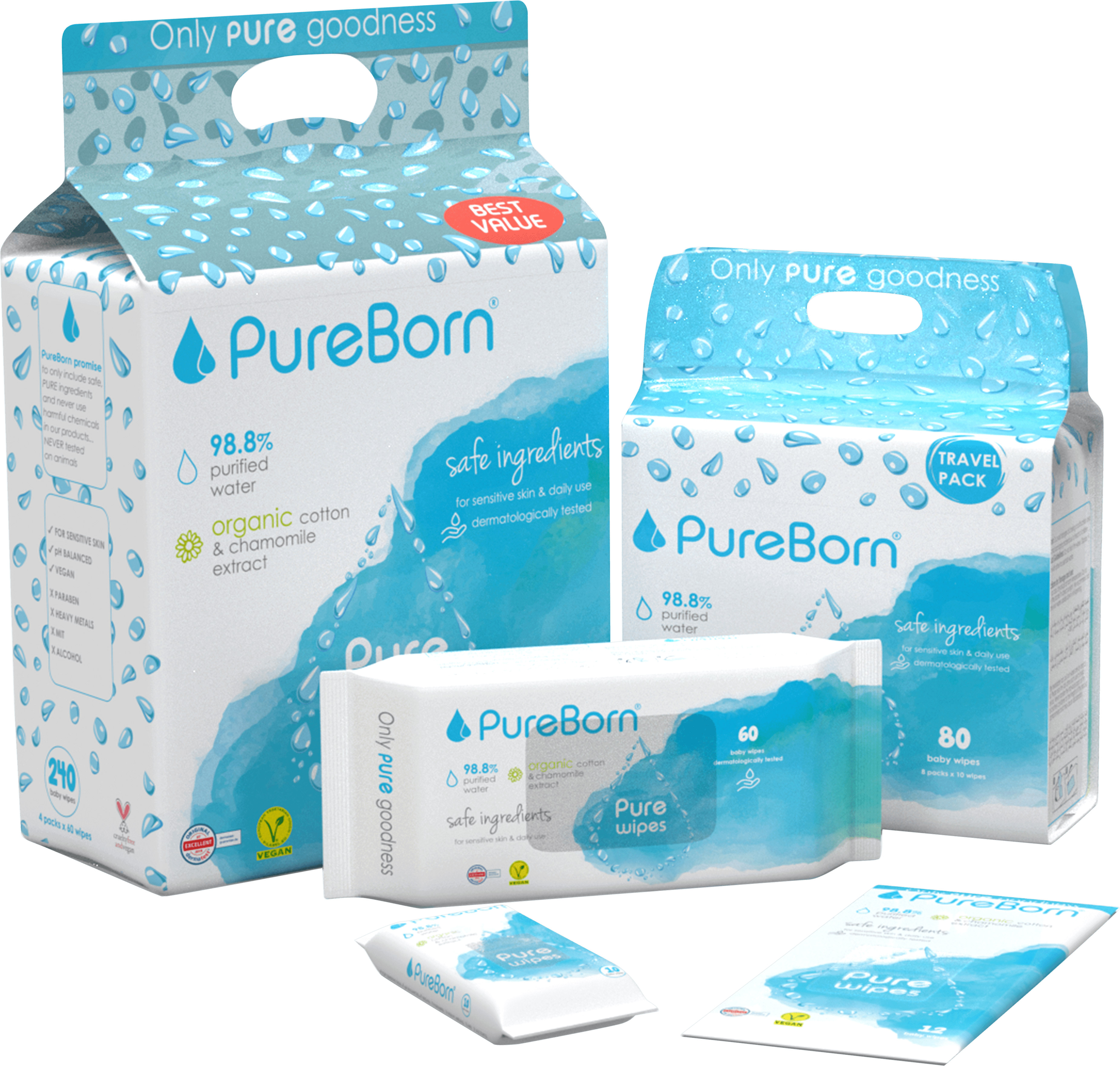 The PureBorn Wipes are made up of 98.8% purified water, organic cotton and extracts of either organic Chamomile or Grapefruit designed to balance skin’s natural pH levels.