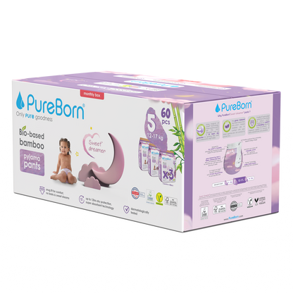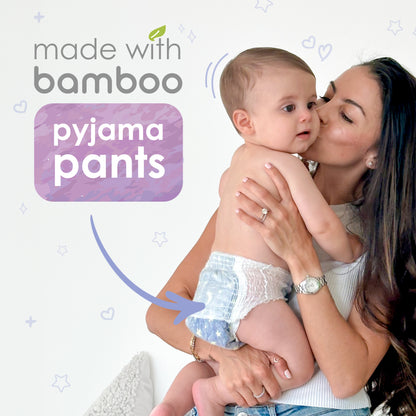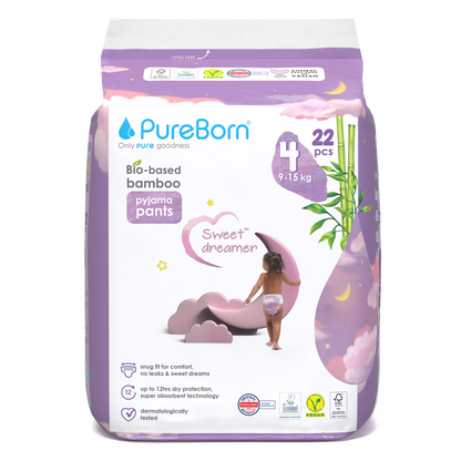 PureBorn Sweet Dreamer night pants adapt perfectly to the shape of baby's body. Designed for dry comfort & flexibility allowing free-movement & maximum support for growing babies. The green biobased top sheet means that only plant-based materials are in contact with your baby's gentle skin, for comfort & protection. These green bio-based bamboo pyjama pants have a snug fit for comfort, no leaks & sweet dreams with up to 12hrs dry protection, super absorbent technology & dermatologically tested. They are FSC certified and have instant dryness technology.